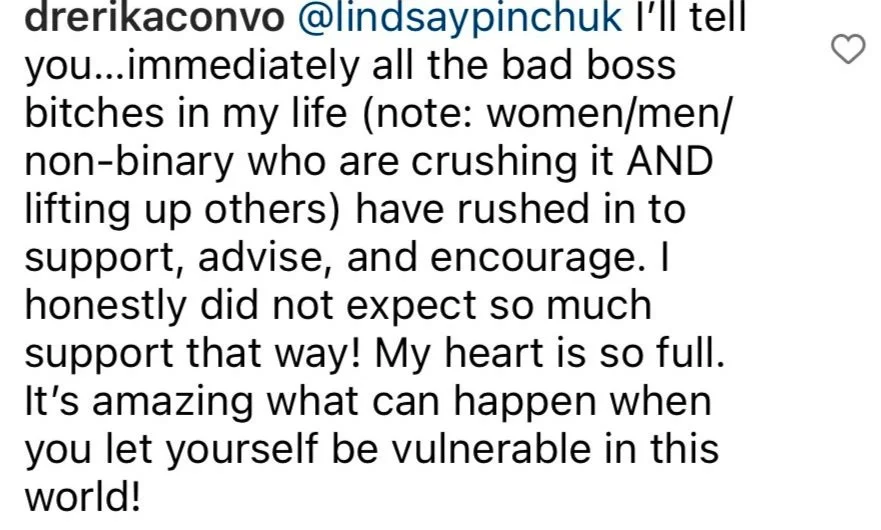 "Your authenticity is everything. You are so disarming and genuine. Your work is thoughtful but you also didn’t kill us with structure. I’m a super structured person and I felt very at ease. There was no slideshow, even though clearly there was a structure and a method. So appreciate your time and your knowledge and you. I’d hire you in a hot second if I could!"