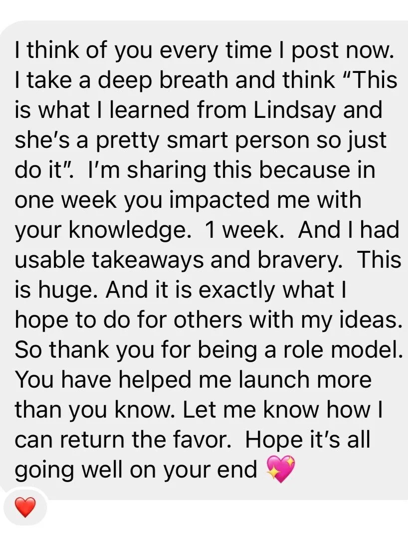 "Lindsay is passionate about helping women build their business and brands and it shines through. She was able to not only provide a top-notch workshop, but also an opportunity for female founders to come together to work together to champion one another. Lindsay offers so much more then what meets the eye and I am so grateful to have had the opportunity to work and learn with and from her."